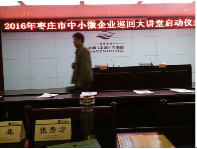 2016年3月25日至26日,山东昕彤机械有限公司组织部门负责人以上管理人员参加由枣庄市中小企业局组织的中小企业巡回大讲堂学习,巡回大讲堂在枣庄市市中区海润中粮大酒店举行。枣庄市中小企业局领导到会讲话,各区、市中小企业局领导及部分中小企业负责人参加。